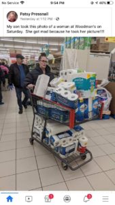 Granted, the person looks like they are a TP hoarder, but how could that be the case? What if she is shopping for a nursing home, hospice, firehouse, police station or EVERYONE in her family? We are all supposed to be #stayingthefuckhome, what if she is the only one healthy enough to do the shopping? what if she is the ONLY essential that can do the shopping?? You assholes “Patsy Pressnall and her son” have no fucking clue!! And on top of it, you spread your hate because of your ignorance!